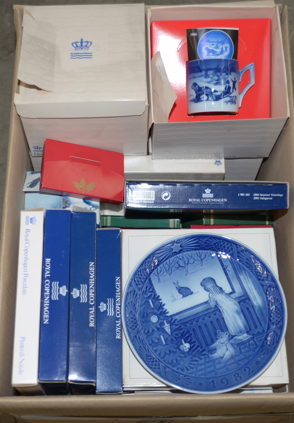 Manifatture Royal Copenhagen e Bing & Grondahl, cartone contenente numerosi piatti decorativi e piccole sculture, in custodie originali (lievi difetti)