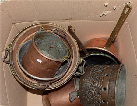 Cartone contenente numerosi oggetti in rame e supporti per vasi (difetti)