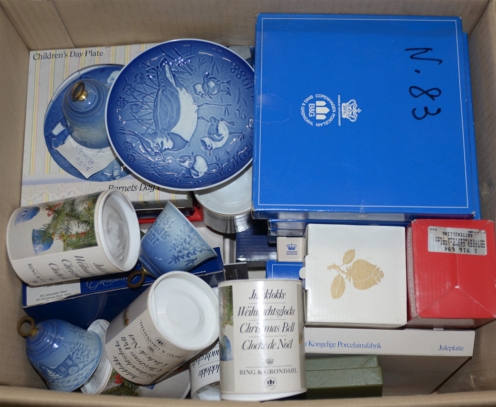 Manifatture Royal Copenhagen e Bing & Grondahl, cartone contenente numerosi piatti decorativi e piccole sculture, in custodie originali (lievi difetti)