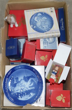 Manifatture Royal Copenhagen e Bing & Grondahl, cartone contenente numerosi piatti decorativi e piccole sculture, in custodie originali (lievi difetti)