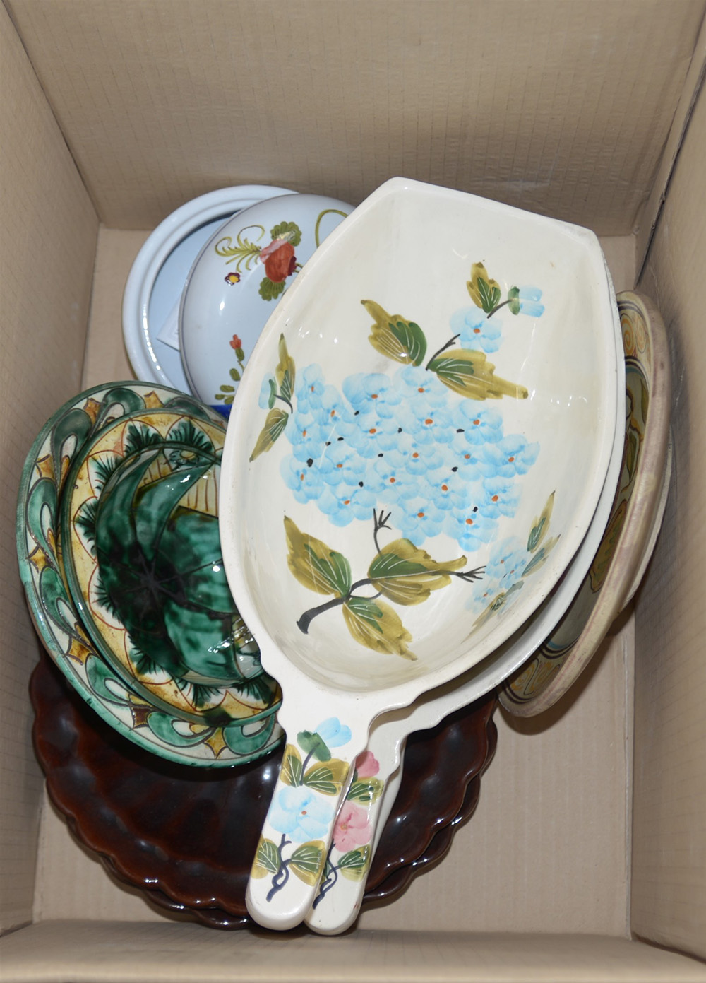 Cartone contenente numerosi oggetti in ceramica dipinti in policromia, di...