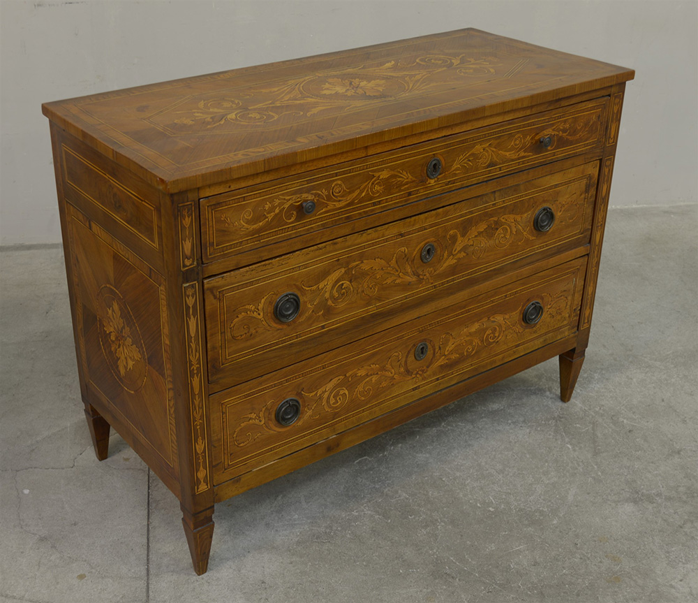 Comò in stile Luigi XVI a due cassetti grandi e uno piccolo sottopiano,...