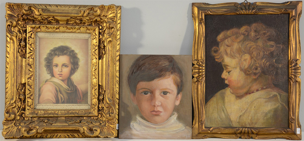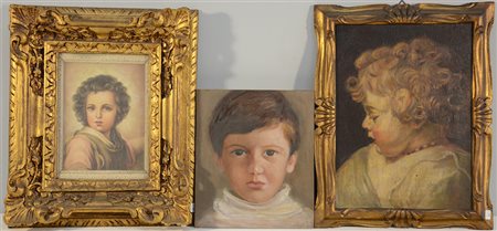 Lotto di tre dipinti ad olio su compensato raffiguranti fanciulli, di autori e misure differenti, due in cornice (lievi difetti)