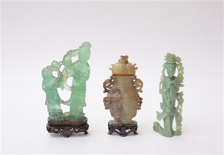 Lotto composto tre sculture di cui due raffiguranti figure e un vaso, due con basi in legno Cina, sec. XX (h. max 21 cm.)