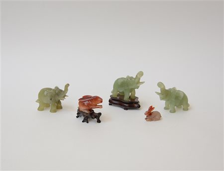 Lotto composto da tre elefantini e due coniglietti in pietra dura Cina, sec. XX (h. max 7 cm.)
