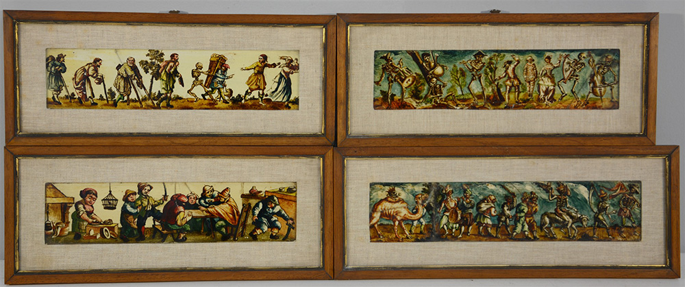 Lotto di quattro composizioni caricaturali (cm 7x29 e 7x32), in cornici (difetti)