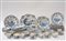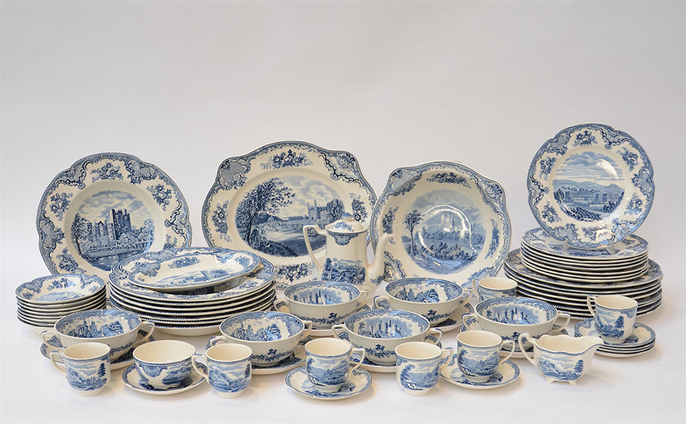 Manifattura inglese Johnson Bros, parte di servizio da tavola, serie “Old Britain Castles”, composto da otto piatti fondi e otto piani, otto piattini da frutta, sei tazze da consommé con piattini, otto coppette, una insalatiera e due piatti ovali da portata, sette tazzine da caffè con piattini, lattiera, caffettiera e una ciotolina (difetti)