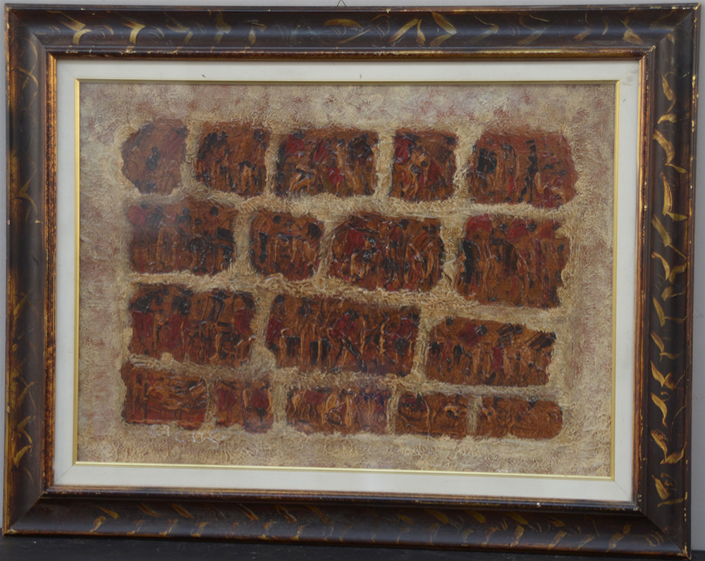 Ignoto sec. XX "Composizione 1989" olio su tela (cm 50x70) reca firma Licos in basso a sinistra. Firmato, iscritto e datato al retro, in cornici (difetti)