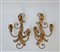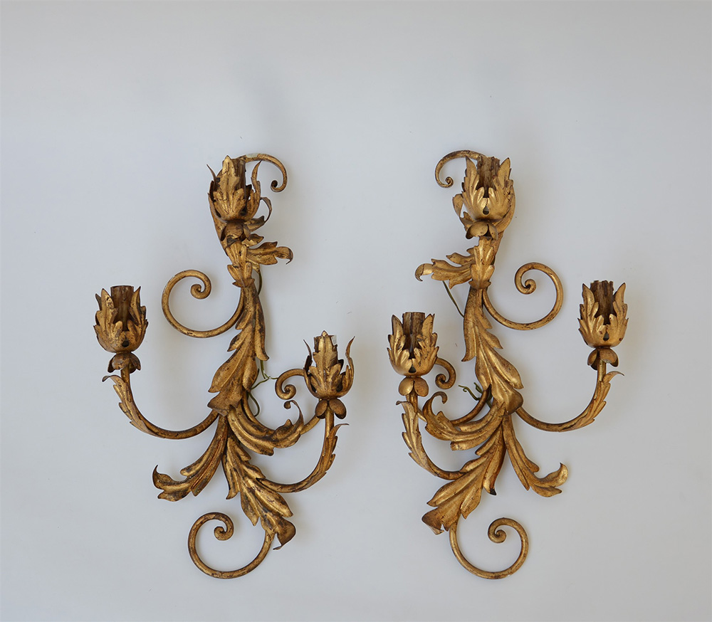 Coppia di appliques a tre fiamme in metallo dorato decorato a motivi vegetali
