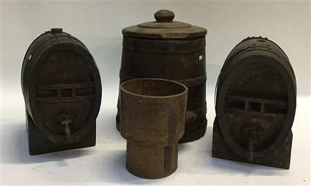 Lotto composto da due botticelle decorative con supporti, un contenitore con coperchio e una misura per farina da un chilogrammo e da mezzo (difetti)