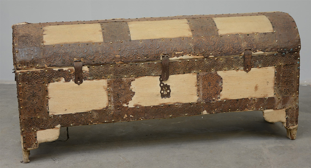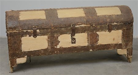 Baule da corredo a dorso d'asino rivestito in tessuto, con fregi decorativi in ferro inciso, battuto e borchiato (cm 130x60x40) (difetti e mancanze)
