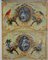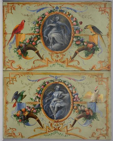 Coppia di sovraporta dipinti in policromia ad olio su tela con vestali entro cartiglio, cornucopie, fiori e pappagalli (cm 68x108)(difetti)