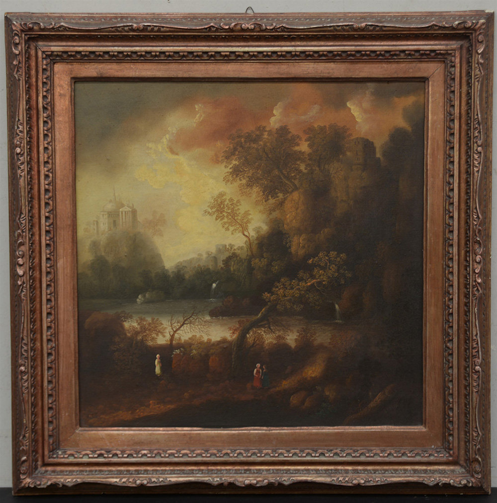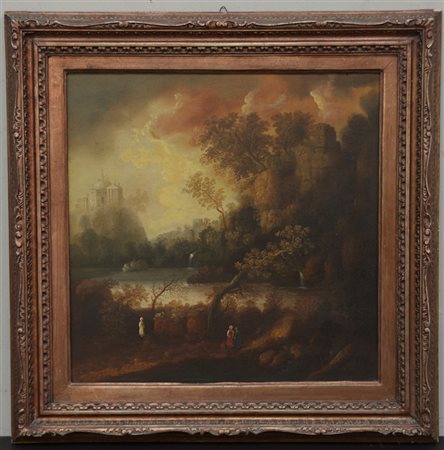 Ignoto "paesaggio fluviale con architetture" olio su tela (cm 50x50) firmato in basso a destra, in cornice