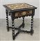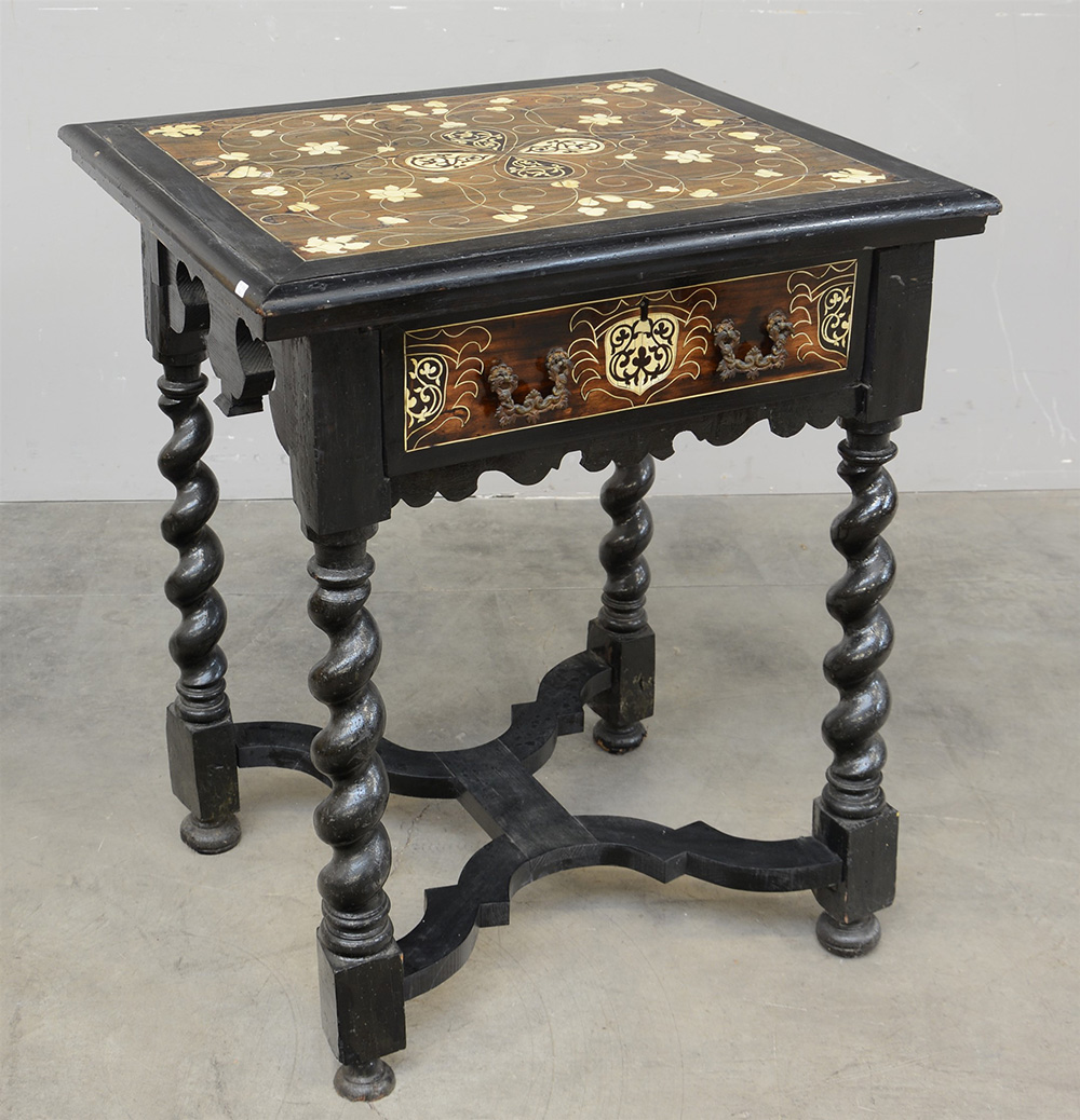 Tavolo da centro in legno ebanizzato ad un cassetto nella fascia, piano intarsiato con rosone centrale e motivi floreali, gambe a torciglione riunite da traverse sagomate (cm 70x86x58)(difetti)