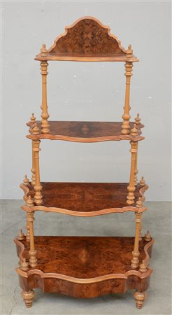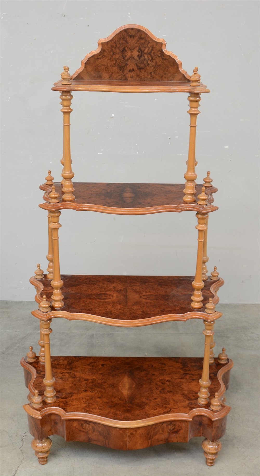 Etagere a quattro ripiani in radica di forma sagomata, un cassetto nella fascia, montanti torniti (cm 75x136x38)(difetti)