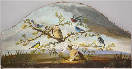 Sovraporta di forma sagomata dipinto ad olio su tela con uccelli su ramo...