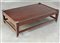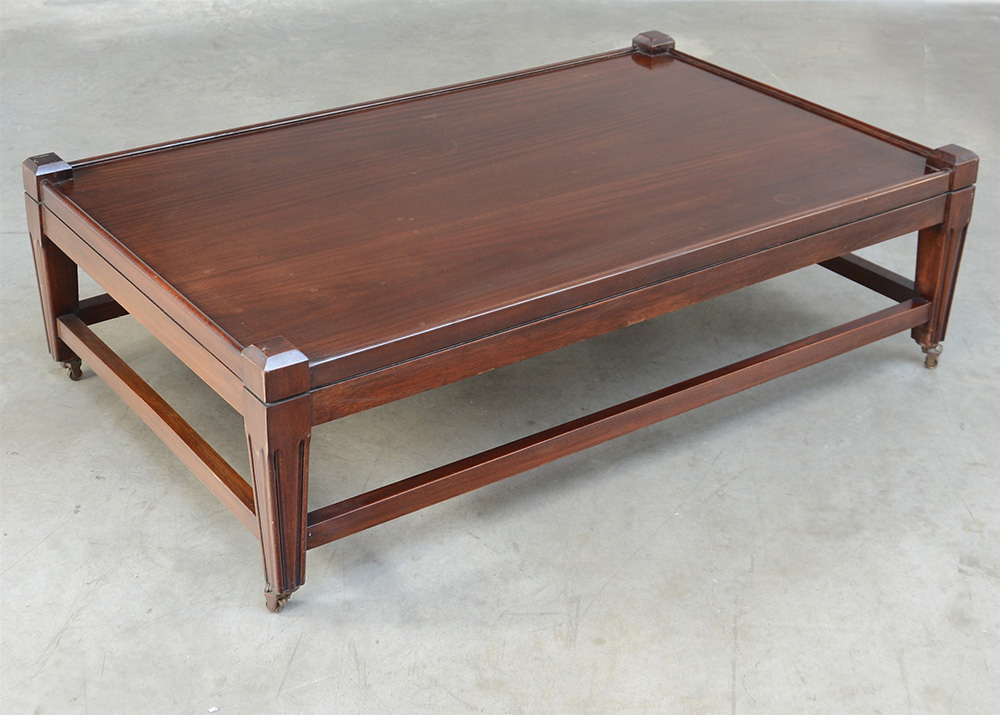 Tavolino da salotto rettangolare con gambe rastremate terminanti con rotelline riunite da traverse (cm 130x42x82)