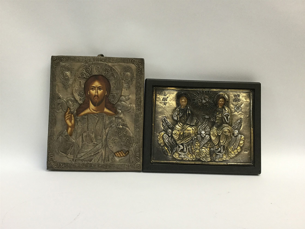 Lotto di due icone di recente produzione con riza in argento e metallo...