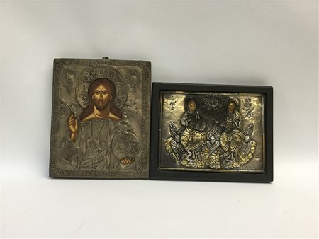 Lotto di due icone di recente produzione con riza in argento e metallo argentato (cm 22x27 e 28x22) (lievi difetti)