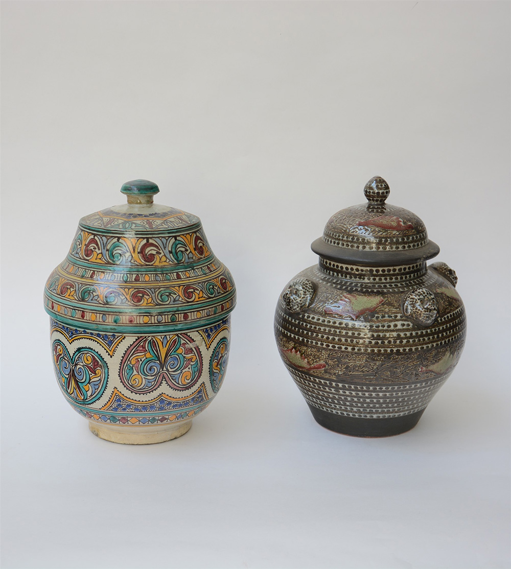 Lotto composto da un contenitore ed un vaso con coperchio in ceramica con decori orientali (h cm 32) (lievi difetti)
