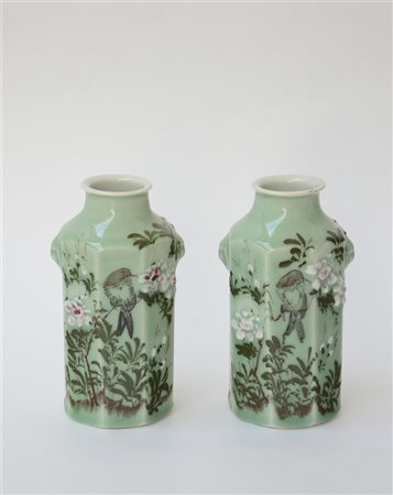Due vasi ottogonali decorati a fiori su fondo celadon (lievi difetti) Cina,...