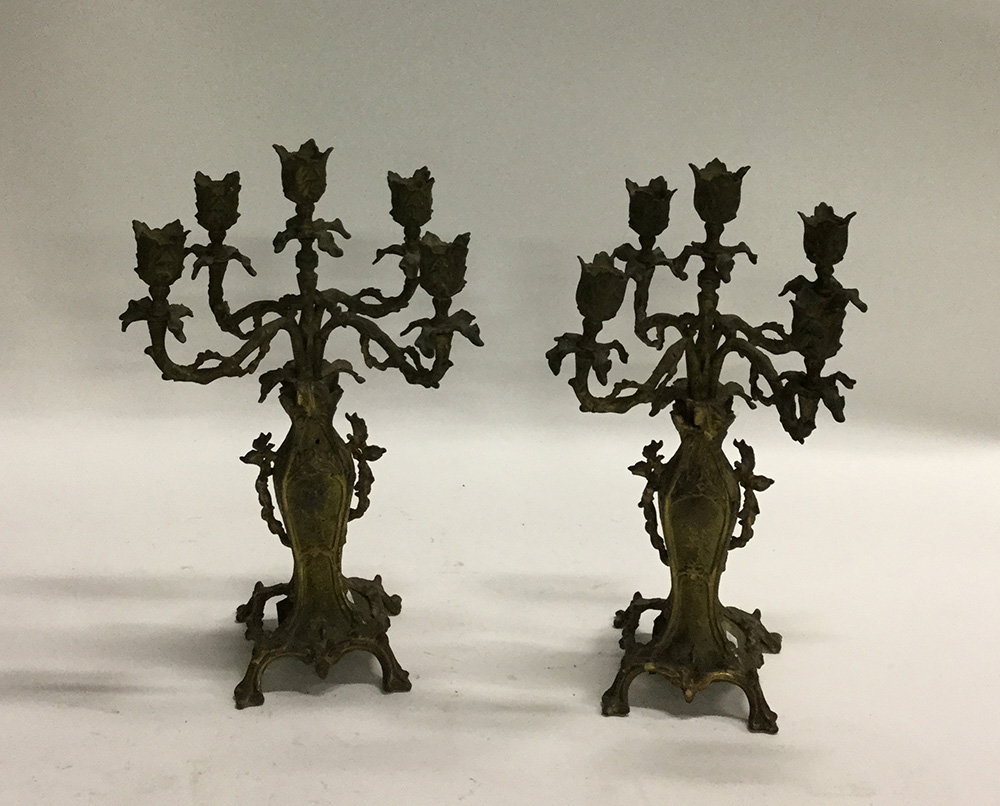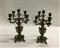 Coppia di candelabri a cinque fiamme in bronzo dipinto color oro e verde; inizio secolo XX (h cm 39) (difetti)