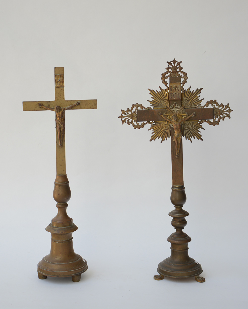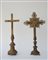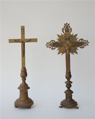 Lotto di due crocifissi in metallo su basi tornite, misure diverse (difetti)