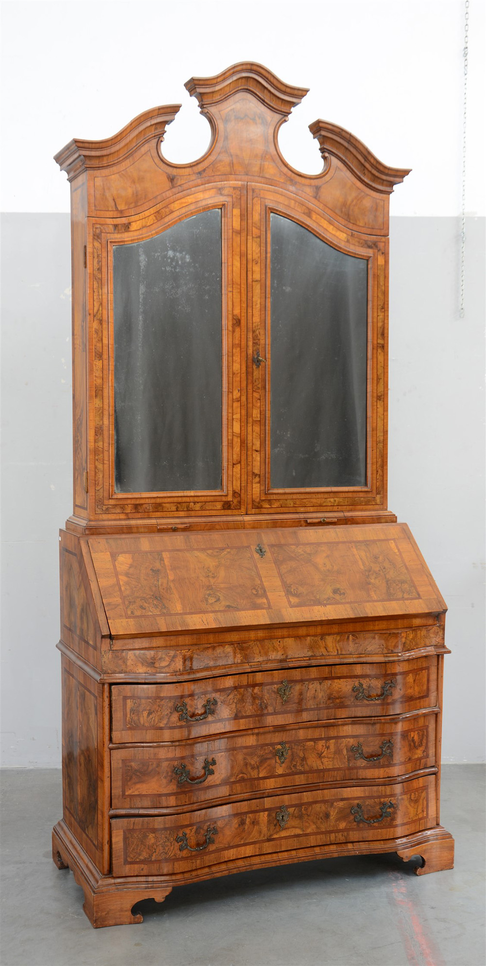Trumeau veneto lastronato in radica e filettato, fronte mosso a tre cassetti, anta ribaltabile celante due cassetti no, uno sportello e vani, parte superiore a due ante a specchio, piedi a mensola (cm 110x230x57)(difetti)