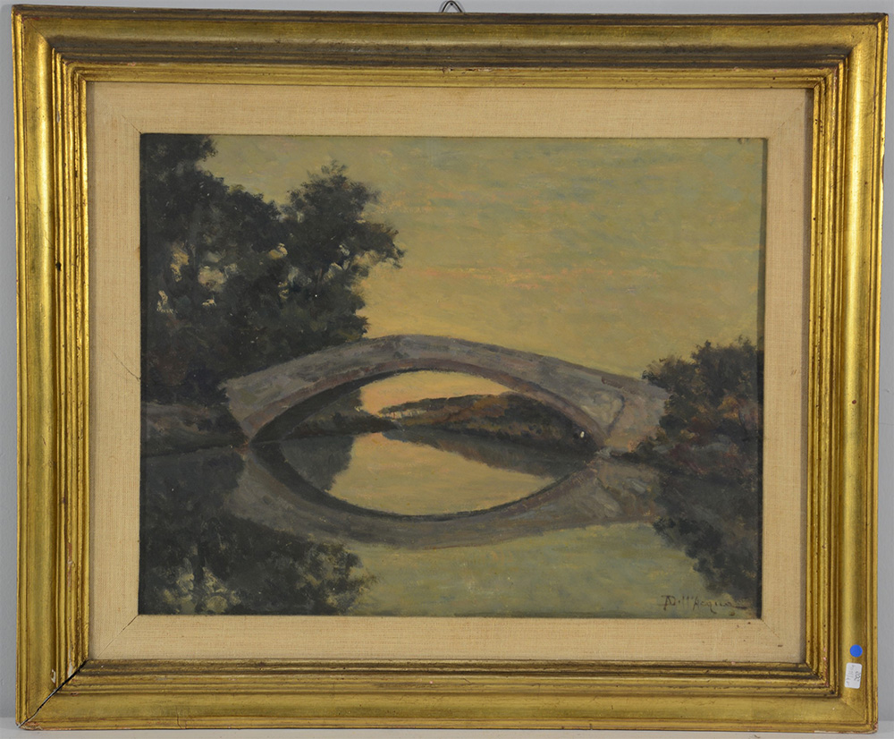 Aldo Dell'Acqua "Paesaggio fluviale con ponte", olio su compensato (cm 32x42) firmato in basso a destra, in cornice (lievi difetti)