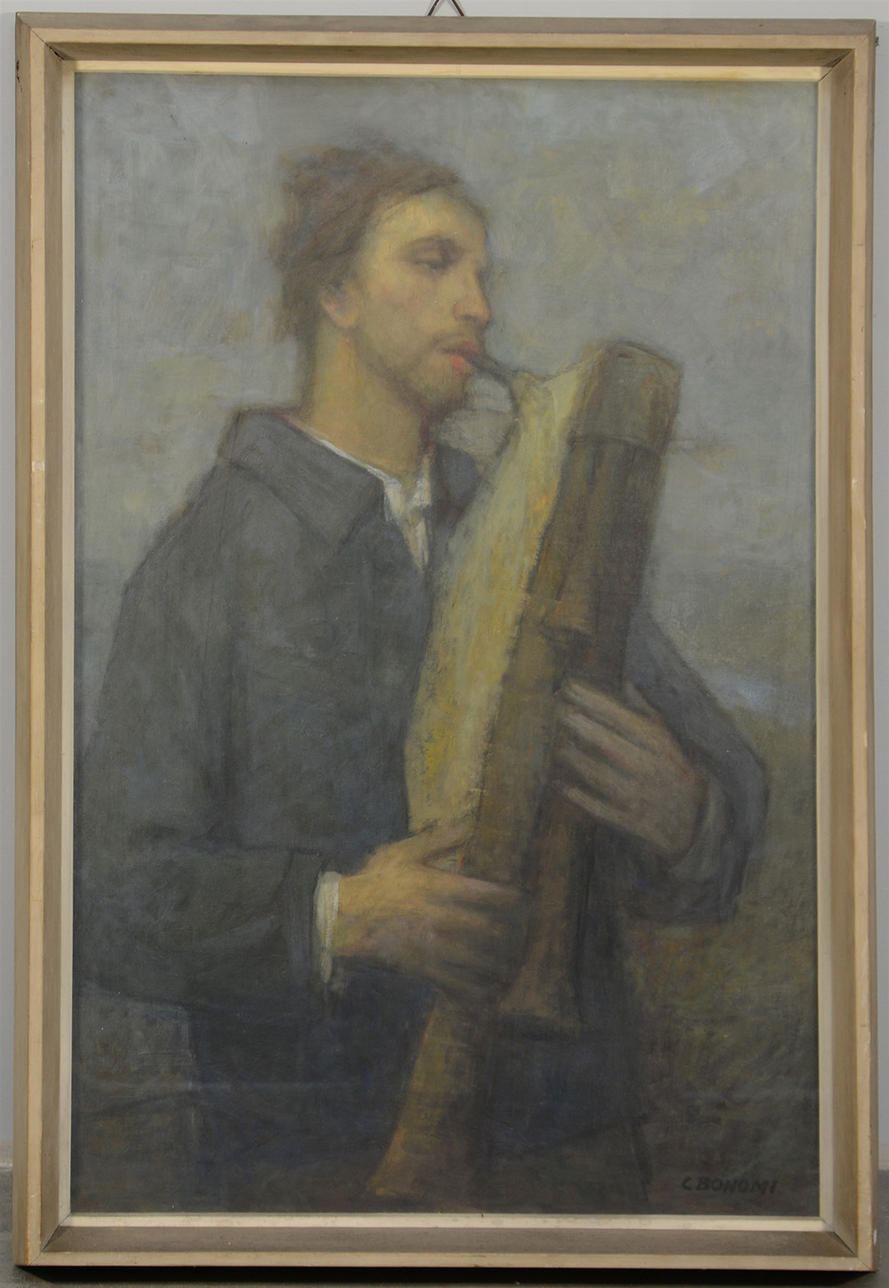 Bonomi C. “Il suonatore di zampogna”, olio su masonite (cm 93x60) firmato in basso a destra, in cornice (lievi difetti)