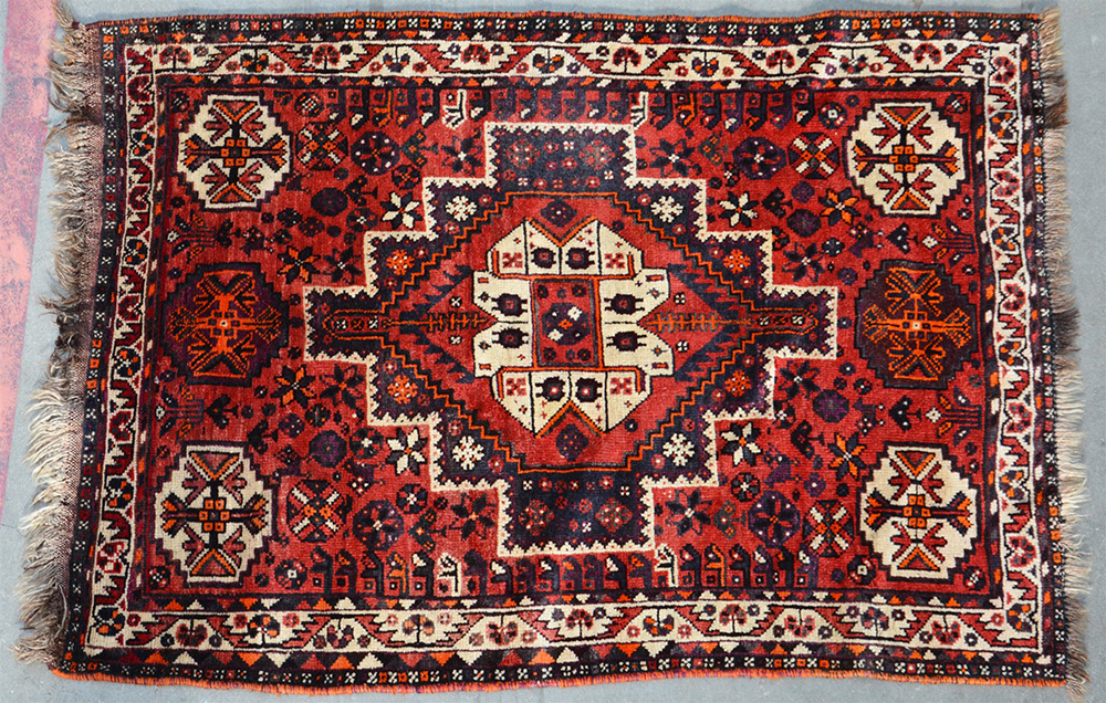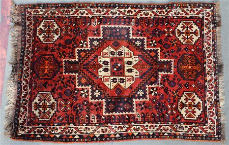 [Tappeti] Tappeto Shiraz, Persia, secolo XX. Disegno a medaglione su campo rosso (cm 156x114) (difetti)