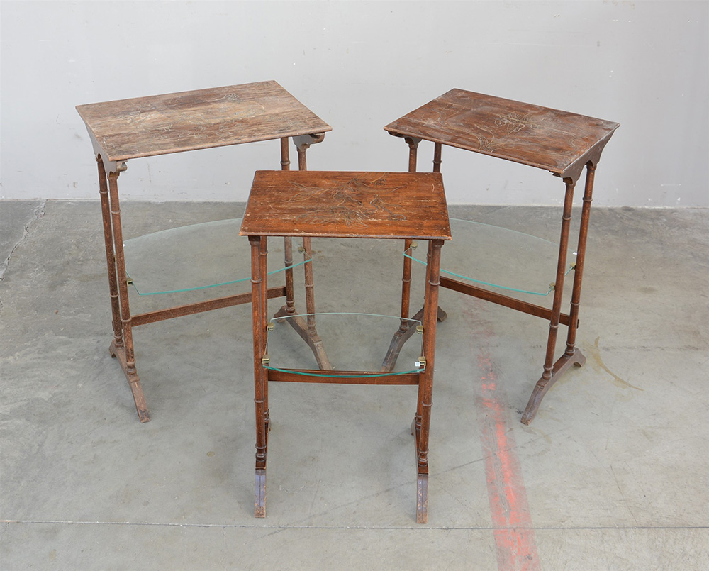 Gruppo di tre tavolini a nido con piani intagliati a motivi Liberty, trasformatia singoli tavolini con pianetti in vetro (difetti)