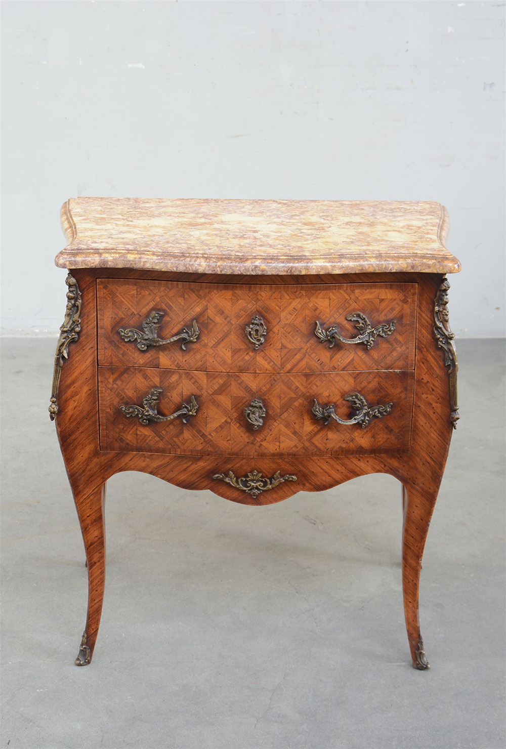 Piccolo comò di forma mossa lastronato a motivi geometrici, cassetti sul fronte. Piano in marmo (cm 67x79x43)