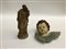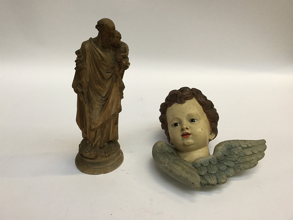 Lotto composto da una scultura in gesso patinato raffigurante San Giuseppe col Bambino (h cm 31), e una testa di Cherubino in legno intagliato e dipinto (h cm 27) (difetti)