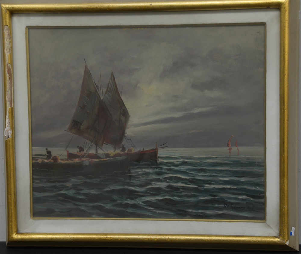 Firma indecifrata "Paesaggio con pescatori" olio su masonite (cm 40x50) firmato in basso a destra, in cornice