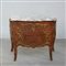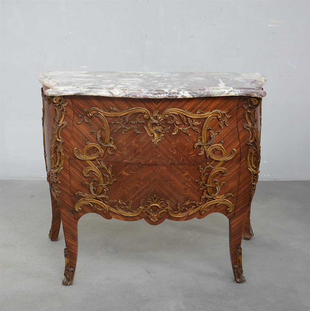Comò di forma mossa lastronato e intarsiato a motivi vegetali a due cassetti curvi sul fronte riccamente decorato con applicazioni in metallo dorato a volute e motivi fogliacei. Piano in marmo. Francia inizio sec. XX (cm 110x98x60)