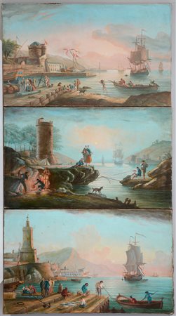 Ignoto "Scorci portuali con velieri" gruppo di tre dipinti ad olio su tela...