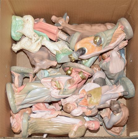 Cartone contenente numerose statue da presepe in gesso dipinto (h max cm 25) (difetti)