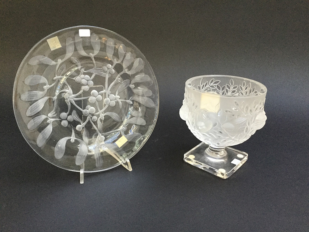 Manifattura di Lalique, lotto composto da una coppa con bordo opalescente decorato, ed un piatto con decoro a ramages e bacche; firmati a punta (h cm 13,5 e d cm 22) (lievi difetti)