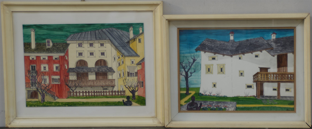 Lotto di due acquarelli raffiguranti case, firmati Pasquali. Misure diverse, in cornici (difetti)