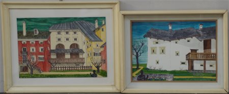 Lotto di due acquarelli raffiguranti case, firmati Pasquali. Misure diverse,...