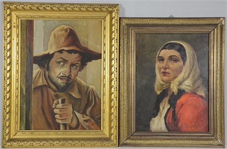Lotto di due dipinti ad olio, su compensato e masonite, raffiguranti un ritratto femminile e una figura maschile, autori differenti (in cornici)