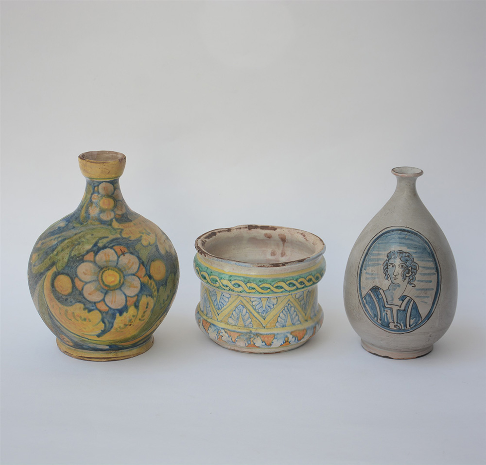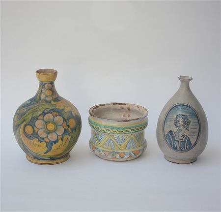 Lotto composto da due fiasche ed una ciotola in maiolica policroma con decori dall'antico, misure diverse (lievi difetti)
