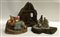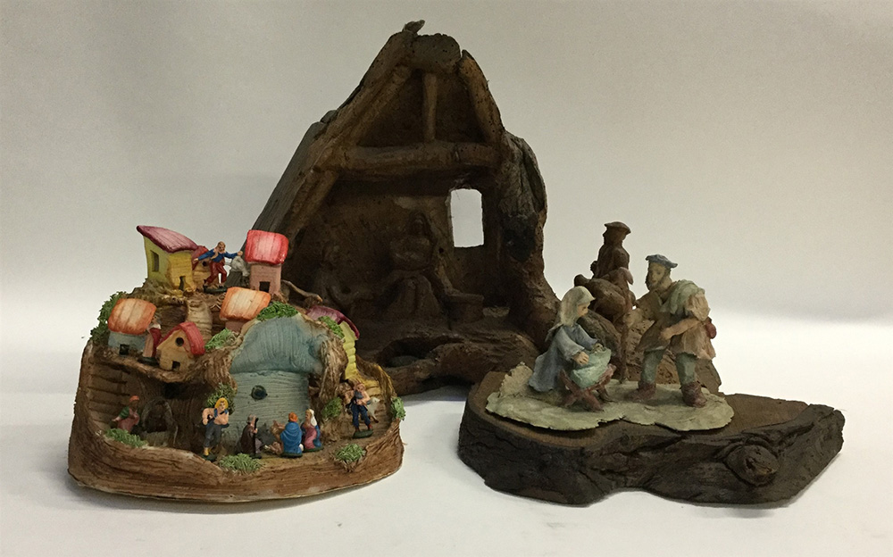 Lotto composto da una capanna con presepe in legno intagliato ed altri due presepi di differenti fatture e materiali (difetti)