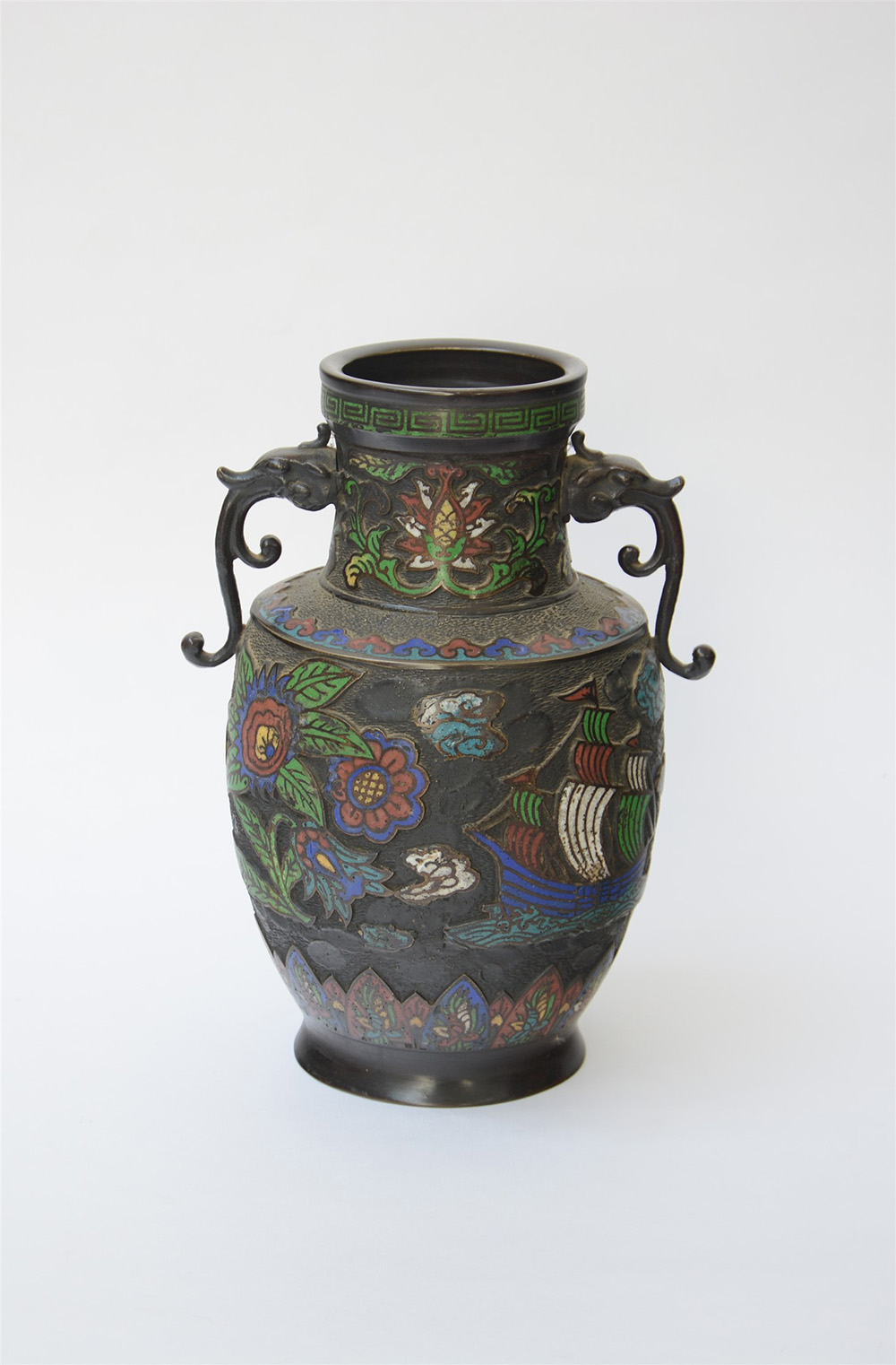 Vaso orientale in metallo cloisonné con anse zoomorfe decorato a smalti e...