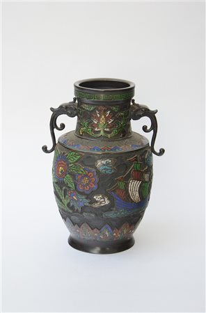 Vaso orientale in metallo cloisonné con anse zoomorfe decorato a smalti e motivi floreali in rielivo, marchio apocrifo sul fondo (lievi difetti) Cina, sec. XX (h. 30 cm.)