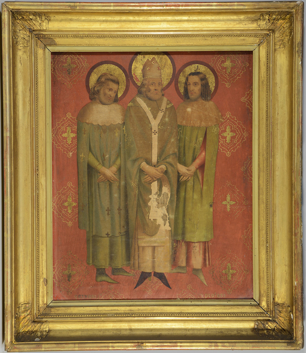 Ignoto, “Vescovo tra i santi Gervasio e Protasio” stampa retouchè incollata su tela (cm 64x49), in cornice dorata (difetti)