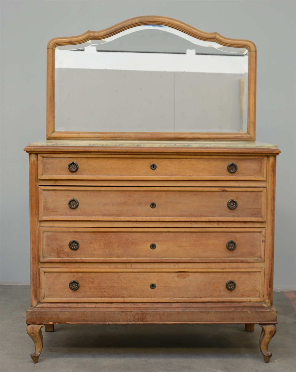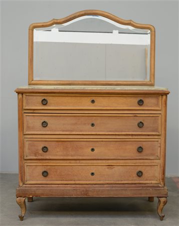 Comò lastronato in legno dolce a quattro cassetti con gambe anteriori mosse e piano in marmo bianco, completo di specchiera con cornice mossa; anni '30 del secolo XX (mobile cm 120x105x53) (difetti)