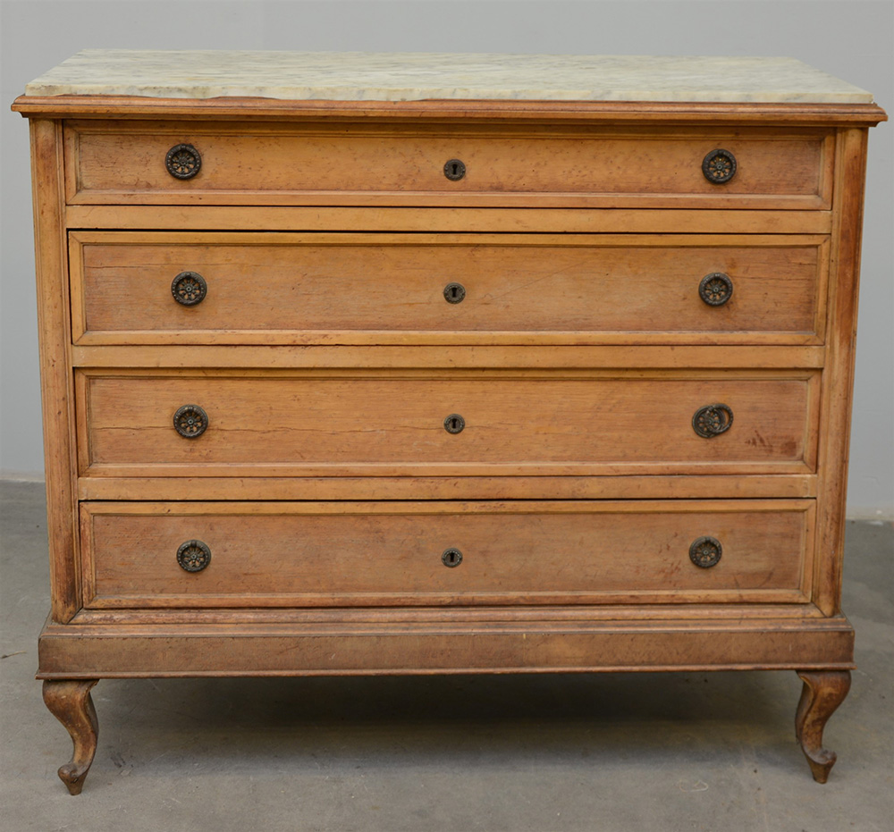 Comò lastronato in legno dolce a quattro cassetti con gambe anteriori mosse e piano in marmo bianco; anni '30 del secolo XX (mobile cm 120x105x53) (difetti)