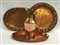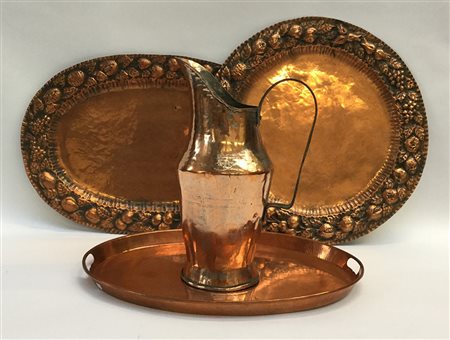 Lotto composto da una brocca e tre vassoio in rame, di cui due con tese sbalzate con teoria di frutti (lievi difetti)